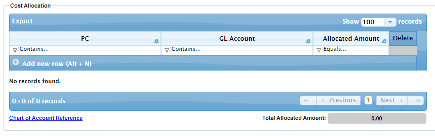 To add a new row for cost allocation entry, Click the + sign beside Add New Row, or press Alt + N.