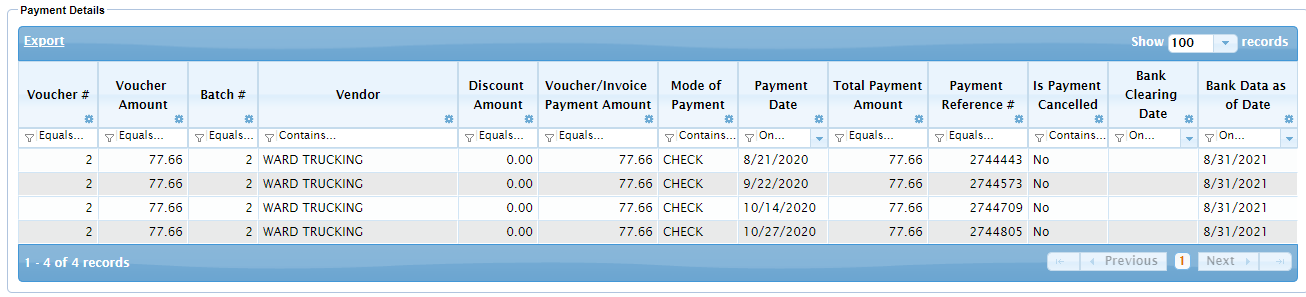 | Payment Reference | Displays any applicable reference number for the payment such as a check number. Select the link to view all vouchers associated with that payment reference number. |