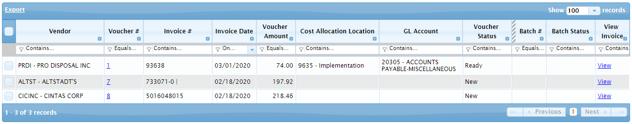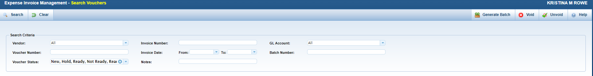| Voucher Status | Displays the status of the invoice record. Statuses include New, Hold, Not Ready, Ready, Void, Batched, and Paid. |